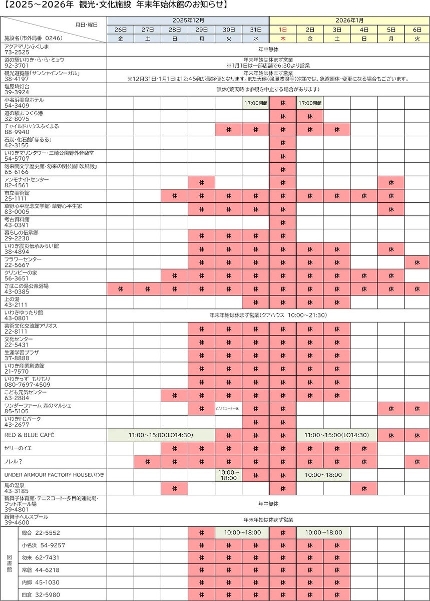 - 2025年~2026年 いわき市内観光 文化施設 年末年始休館のお知らせ